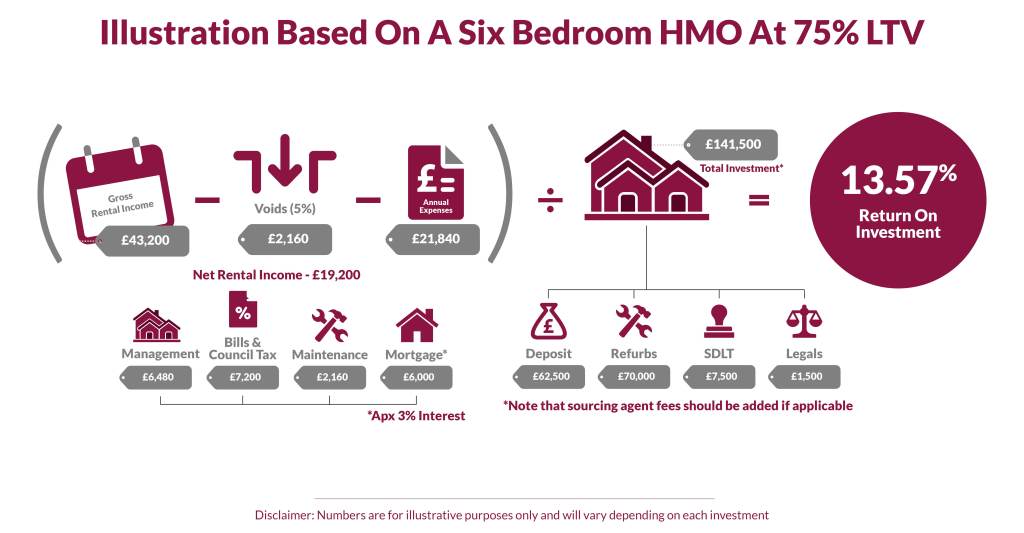 For our illustration I have not included capital appreciation as you cannot make a direct comparison between an HMO and single let due to how an HMO is valued differently.