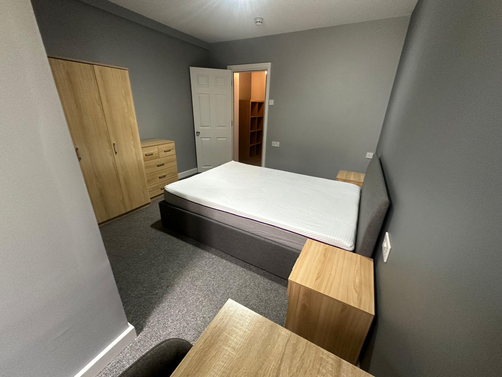 Room includes a double ottoman bed, wardrobe, chest of draws, two bedside units, desk and chair.
