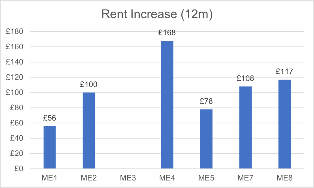 When looking at rents, the average sits at around £1,000 per month, however, there is some degree of variation. I have compiled ME3 using limited data, so whilst this is an anomaly it is still a helpful indicator.